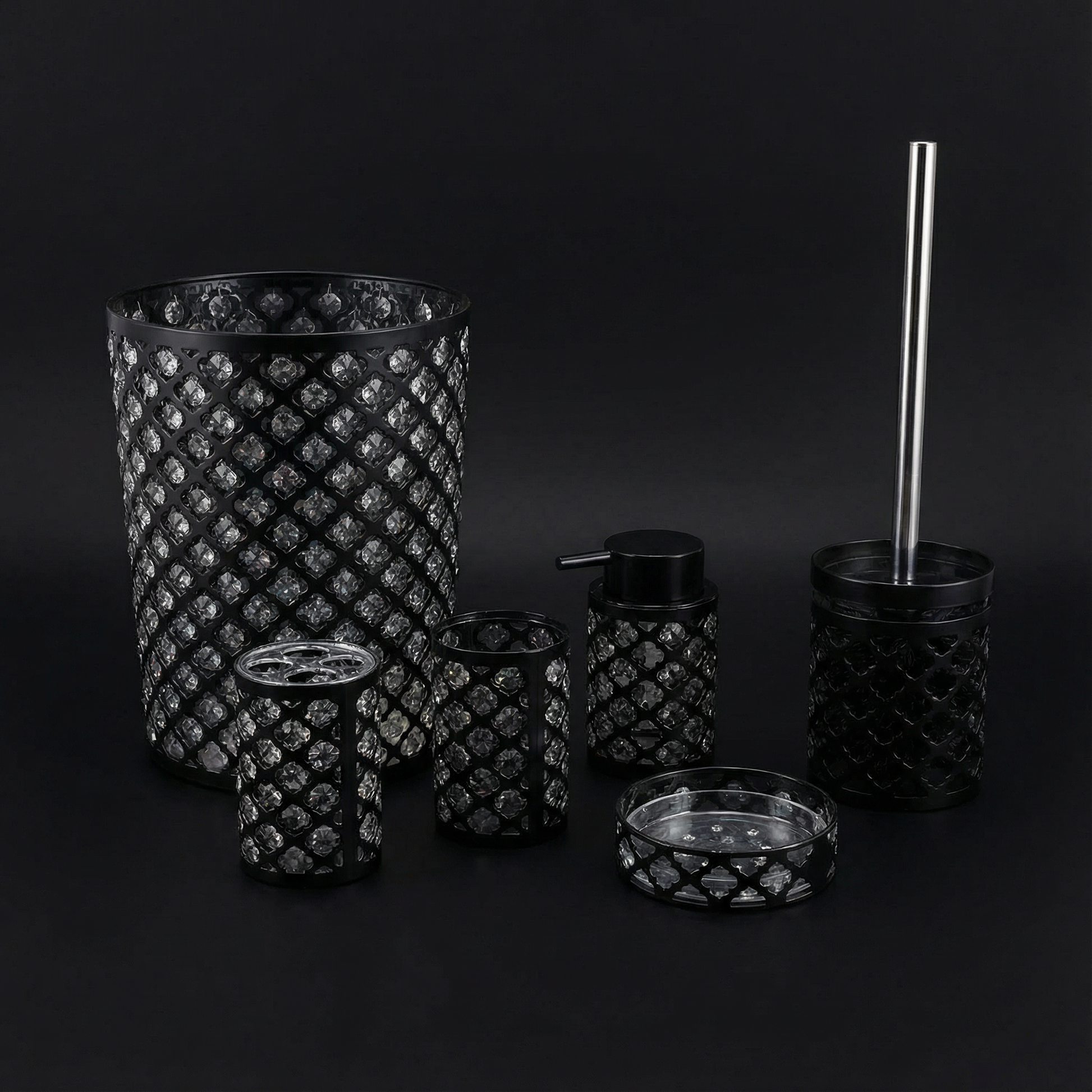 Transform your bathroom into a sparkling sanctuary with the Geneva Bath Accessory Set, a stunning 6-piece collection that combines the luxurious look of cut crystal with the durability of shatter-resistant acrylic. Each piece features an intricate diamond lattice pattern that catches and reflects light beautifully, creating a dazzling display of elegance while remaining completely safe and practical for everyday use.